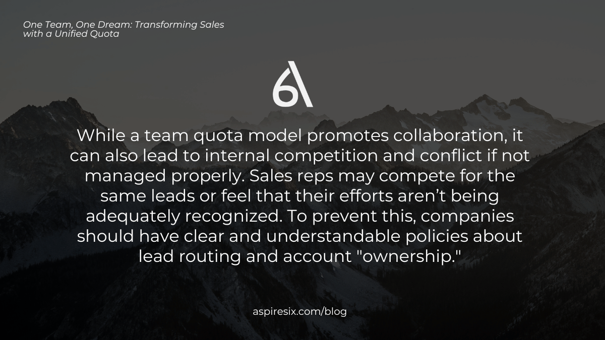 While a team quota model promotes collaboration, it can also lead to internal competition and conflict if not managed properly. Sales reps may compete for the same leads or feel that their efforts aren’t being adequately recognized. To prevent this, companies should have clear and understandable policies about lead routing and account “ownership.”